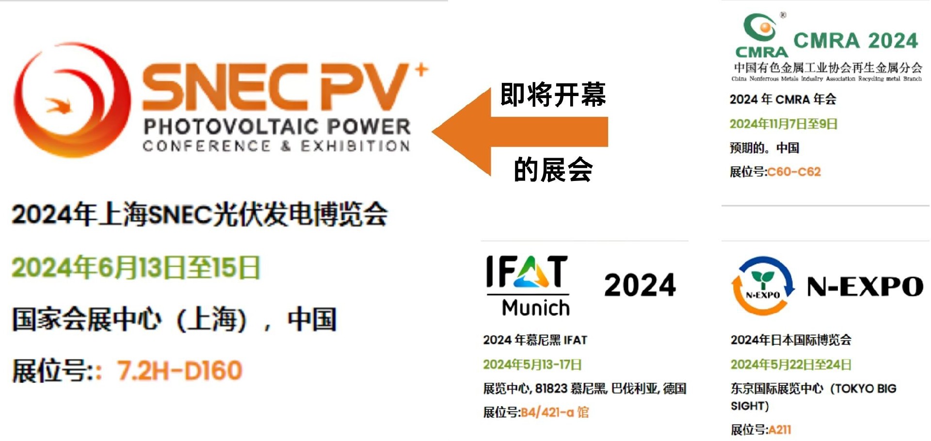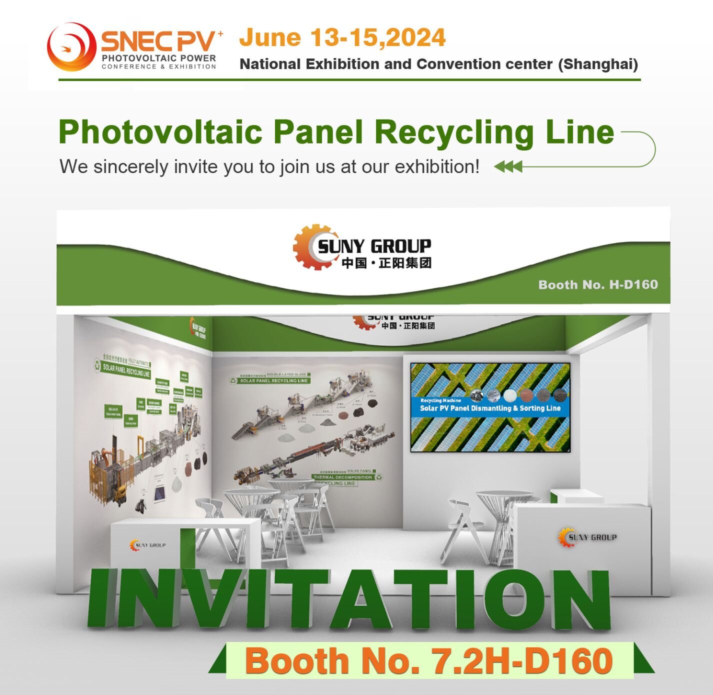 在全球光伏產(chǎn)業(yè)經(jīng)歷了20年的快速發(fā)展之際,“SNEC PV+第十七屆(2024)國(guó)際太陽(yáng)能光伏與智慧能源(上海)大會(huì)暨展覽會(huì)”(簡(jiǎn)稱“SNEC PV+ 2024光伏兩會(huì)”)將于2024年6月11日至15日在國(guó)家會(huì)展中心上海洲際酒店(上海市諸光路1700號(hào))與國(guó)家會(huì)展中心(上海市嵩澤大道333號(hào))隆重舉行。作為光伏行業(yè)的頂級(jí)盛會(huì),本次大會(huì)將為中國(guó)和全球光伏業(yè)的未來(lái)發(fā)展提供一個(gè)深入研討和交流的平臺(tái)。正陽(yáng)集團(tuán)(Suny Group)作為一家環(huán)保設(shè)備制造商,將參與這場(chǎng)盛會(huì),共同探討光伏板回收新技術(shù)、新方案、新舉措。期待與您在展會(huì)上交流!